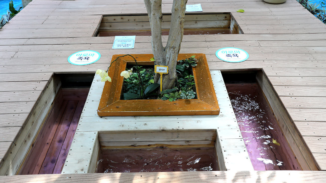 사계절 온도 조절이 가능한 실내 수영장에서는 음료 반입이 가능하며, 전문 강사진의 아쿠아 테라피 프로그램도 운영됩니다. 2025년 신설된 해수 테라피존에서는 미네랄이 풍부한 해수욕을 즐길 수 있습니다. - 솔잎 족욕탕