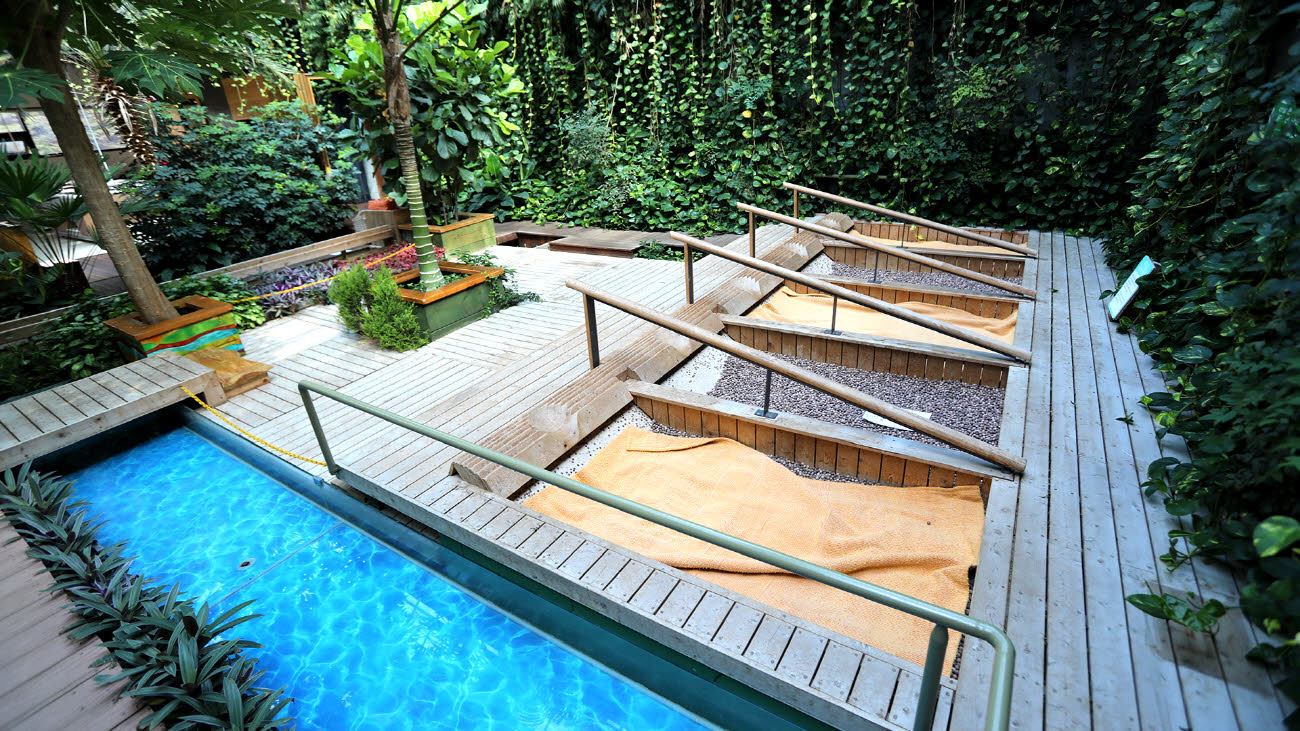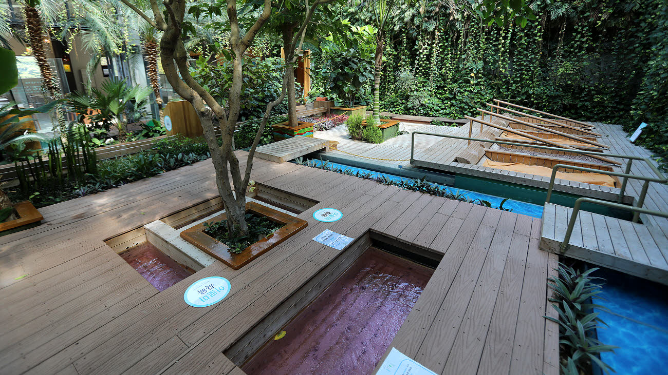 대한아로마테라피협회의 자문을 받아 설계된 아로마 테라피실은 계절별 맞춤형 향기 테라피를 제공합니다. 전문 테라피스트의 상담을 통해 개인별 맞춤 프로그램을 경험할 수 있습니다. - 실내 워터힐링존