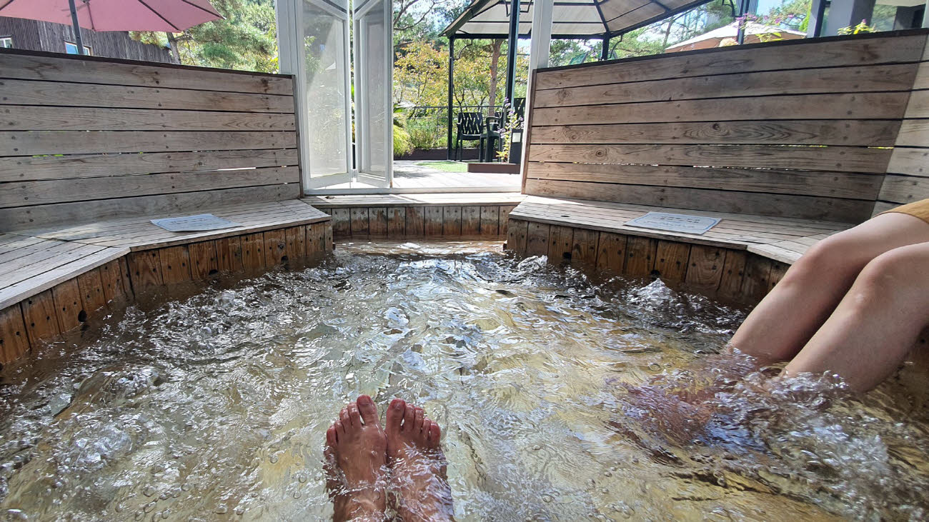 국내산 솔잎을 사용한 족욕탕은 피로회복과 혈액순환 개선에 도움을 줍니다. 2025년부터는 족욕과 함께 즐길 수 있는 전통차 서비스도 제공됩니다.